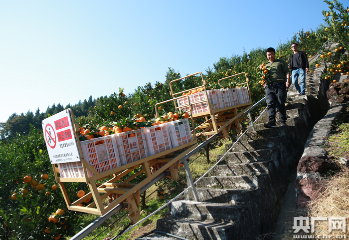 一箱箱新鮮的柑橘“乘坐”單軌運(yùn)輸機(jī),從橘園深處來到橘林外的通暢公路,打箱裝車,運(yùn)往縣城或集鎮(zhèn)的物流點(diǎn),運(yùn)往山外的大中城市。