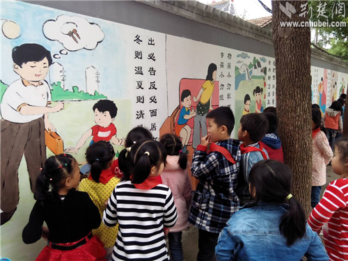上周日,武漢輕工大學(xué)藝術(shù)與傳媒學(xué)院晨曦志愿服務(wù)團隊的56名同學(xué)來到先進小學(xué),為學(xué)校的兩面墻上繪上《弟子規(guī)》主題水粉畫。經(jīng)過一天的努力,44幅主題畫、1002個字將整部《弟子規(guī)》在墻上呈現(xiàn)出來。