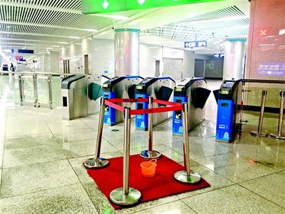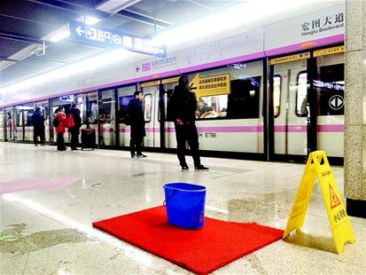 前日中午,陰雨綿綿。記者來(lái)到二七小路站,從B出口剛進(jìn)入站廳,就看到一處漏水點(diǎn),地面有一點(diǎn)潮濕,放著“小心滑倒”的提示牌。在候車站臺(tái)處,有三處漏水點(diǎn),共擺放了5個(gè)桶和盆,桶下面還鋪了一張紅色地毯,防止乘客滑倒。