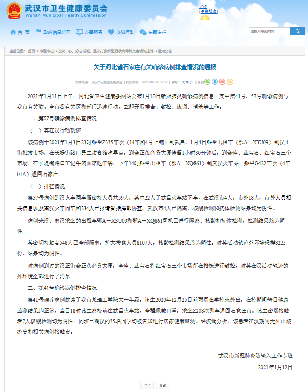 第41號(hào)確診病例就讀于我市某理工學(xué)院大一年級(jí)。該生2020年12月25日前兩周在學(xué)校未外出,在校期間每日健康監(jiān)測(cè)結(jié)果均正常,當(dāng)日18時(shí)該生離校前往武昌火車站,全程佩戴口罩,乘坐Z208次列車返回石家莊市。該生密切接觸者7人核酸檢測(cè)均為陰性,同班已離漢的35名同學(xué)均被告知進(jìn)行居家健康監(jiān)測(cè)。經(jīng)流調(diào)分析,該患者在漢期間無(wú)外出旅游史和相關(guān)病例接觸史。