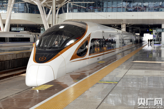 圖為:12月12日,G363次“金鳳凰”復(fù)興號(hào)動(dòng)車組正點(diǎn)到達(dá)武漢站。央廣網(wǎng)發(fā) 通訊員盧殿濤 攝)