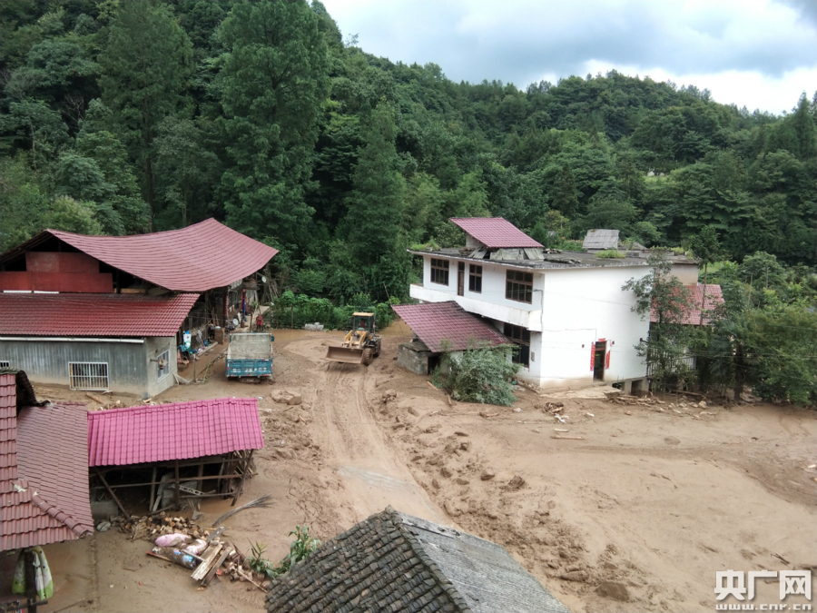 圖為當(dāng)?shù)亟M織機械正在回龍村開展清淤工作(央廣網(wǎng)發(fā) 總臺央廣記者左艾甫 攝)