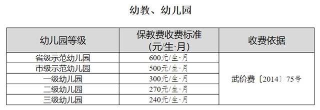 根據(jù)公示,省級(jí)示范幼兒園保教費(fèi)每月600元/生,市級(jí)示范幼兒園500元/生,一級(jí)幼兒園300元/生,二級(jí)幼兒園270元/生,三級(jí)幼兒園240元/生。