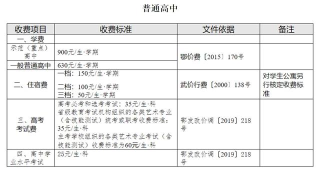 武漢市普通高中收費(fèi)項(xiàng)目,包括學(xué)費(fèi)、住宿費(fèi)、高考考試費(fèi)。其中,示范(重點(diǎn))高中每學(xué)期學(xué)費(fèi)900元/生,一般普通高中630元/生。住宿費(fèi)分3檔:150元/生、100元/生、50元/生,學(xué)生公寓另行核定收費(fèi)標(biāo)準(zhǔn)。
