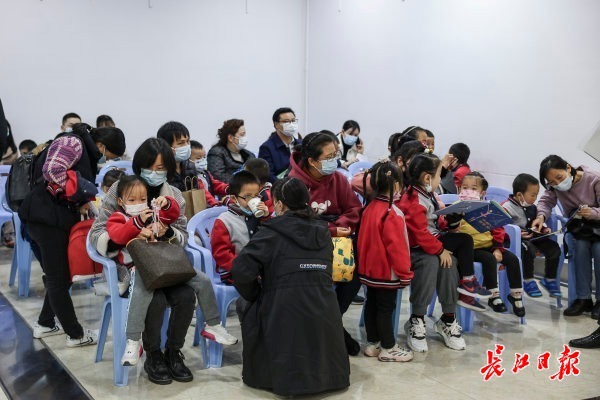 11日,武漢市金銀潭醫(yī)院新冠疫苗臨時(shí)接種點(diǎn),一所幼兒園組織家長(zhǎng)帶小朋友集體接種疫苗。 記者胡冬冬 攝