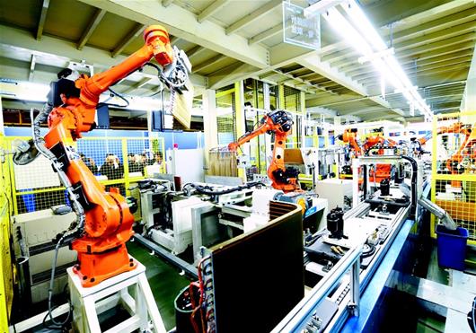 湖北日?qǐng)?bào)訊 圖為美的集團(tuán)武漢制冷設(shè)備有限公司智能制造生產(chǎn)線上的機(jī)器手臂在運(yùn)行。(記者 張朋 攝)