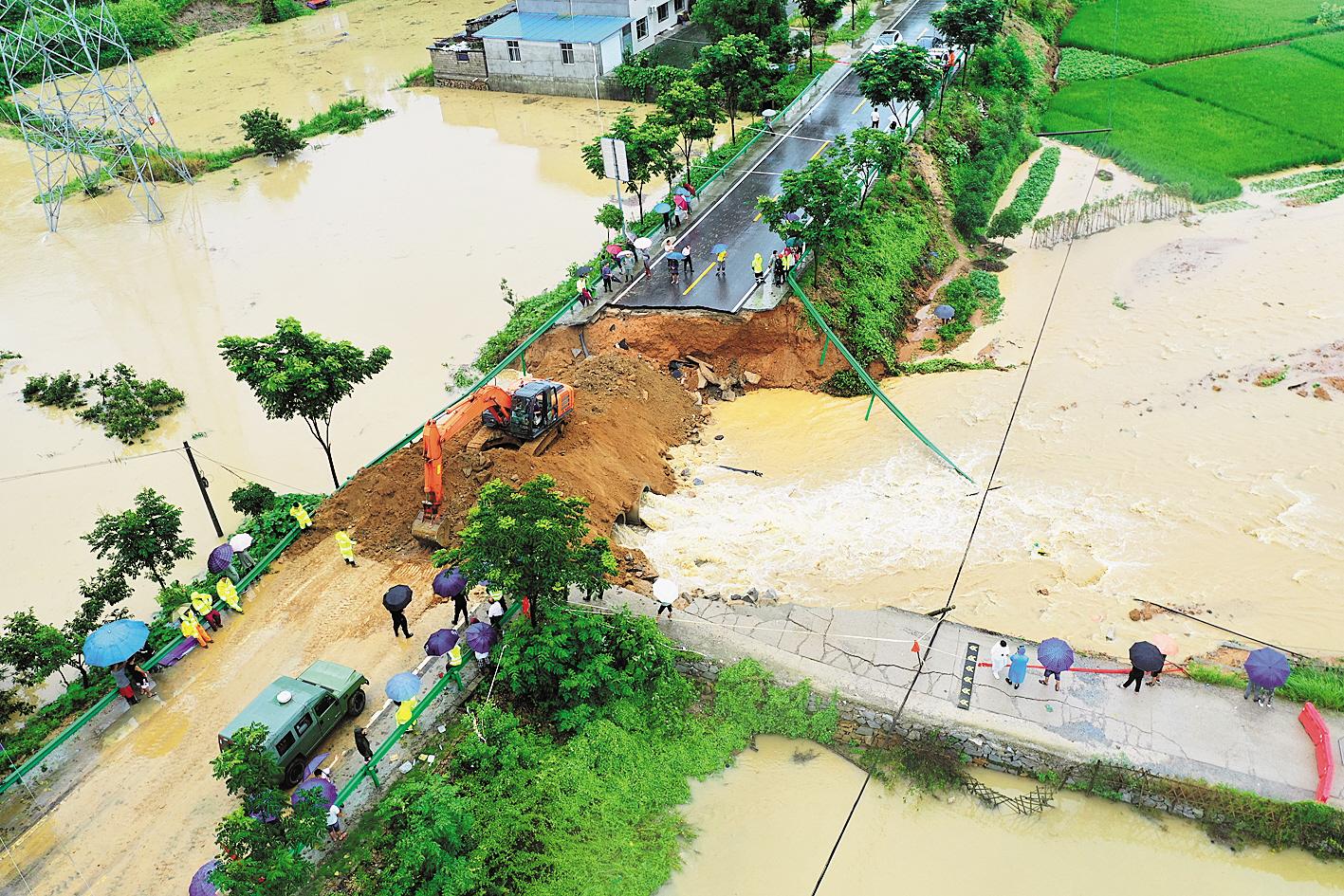 7月6日晨,洪水致318國道羅田縣張八塘路段被沖毀。經(jīng)緊急搶修,當日下午5時許,被毀路段恢復通車。 (湖北日報全媒記者 魏錸 劉申 通訊員 劉世民 攝)