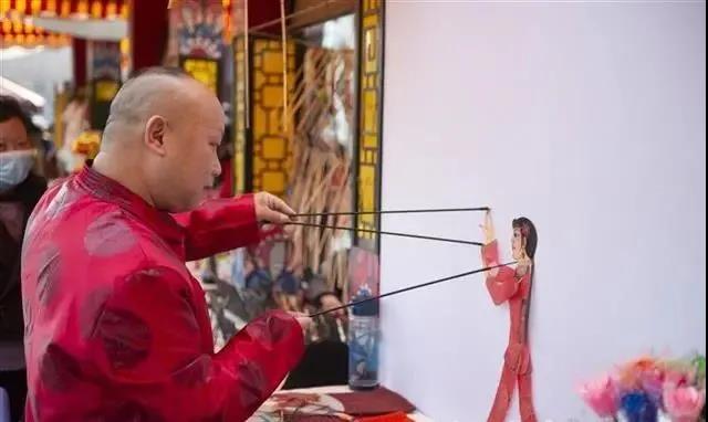 皮影戲匠人正在操縱皮影戲戲曲人物,吸引了不少市民游客前來圍觀。