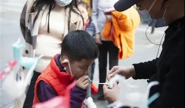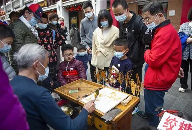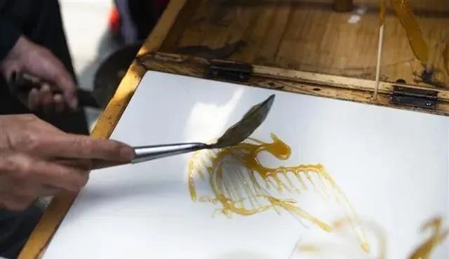 糖畫匠人正在用糖漿畫糖畫,吸引了眾多小朋友前來圍觀。