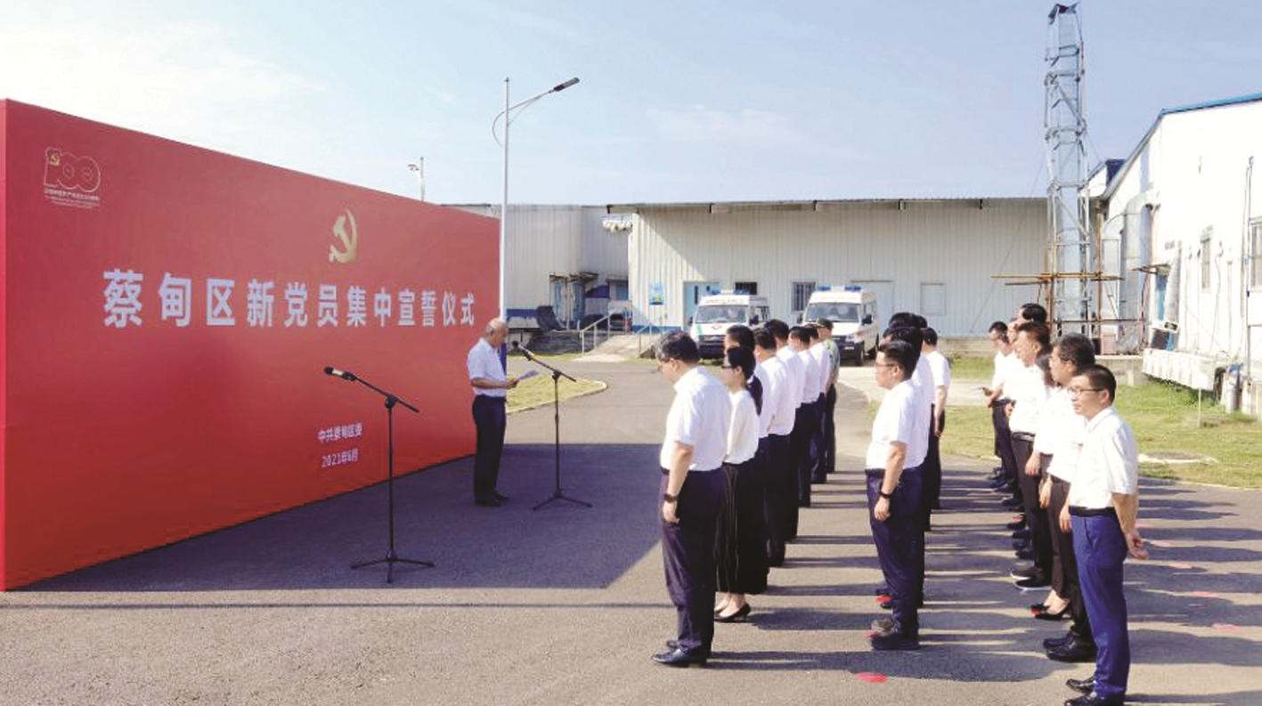 “我志愿加入中國共產(chǎn)黨,擁護黨的綱領(lǐng),遵守黨的章程,履行黨員義務(wù)……”6月25日,蔡甸區(qū)100名新黨員代表在火神山醫(yī)院,面對鮮艷的黨旗莊嚴(yán)宣誓。