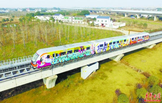 12月15日上午,畫滿涂鴉的磁浮專列從長沙榔梨站經(jīng)過。當(dāng)天,該專列完成“變裝”,從湖南磁浮公司綜合檢修庫駛出,與廣大市民朋友見面。列車兩面的作品由來自國內(nèi)外的20位涂鴉大師聯(lián)手創(chuàng)作,3節(jié)車廂共繪有6幅涂鴉作品,創(chuàng)作者通過構(gòu)圖彼此獨(dú)立、主題相互呼應(yīng)的彩色涂鴉,突出城市幸福感和軌道交通的綠色發(fā)展理念。