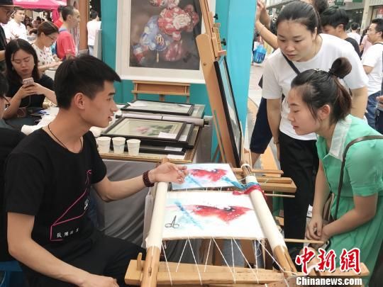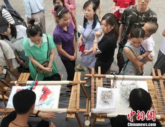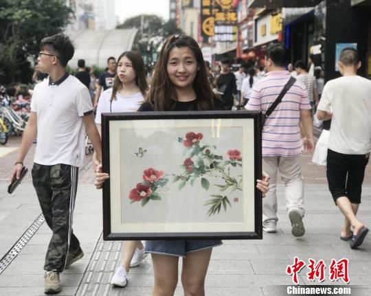湖南工藝美術(shù)職業(yè)學(xué)院的學(xué)生街頭展示湘繡作品!√菩∏ 攝