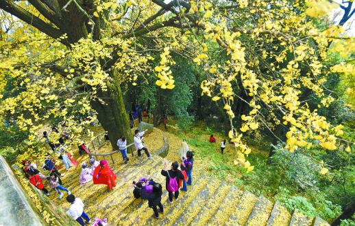 上圖:11月25日,長沙市岳麓山風(fēng)景區(qū)云麓宮,游客在古銀杏樹邊賞景拍照。近日,這株樹齡700多年的古銀杏進(jìn)入了一年中最佳的觀賞期,樹上樹下一片金黃,成了攝影師們“打卡”的網(wǎng)紅樹,也吸引了不少游客慕名前來觀賞。湖南日報記者 田超 攝