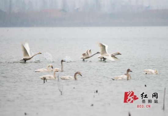 在東洞庭湖采桑湖管理站附近的湖面上,這里聚集了600多只小天鵝。記者看到,天空中還不時有三、五成群的小天鵝飛向這里,每當有同伴到來,湖面上的天鵝就會引吭高歌表示歡迎,并不停地點頭致意。