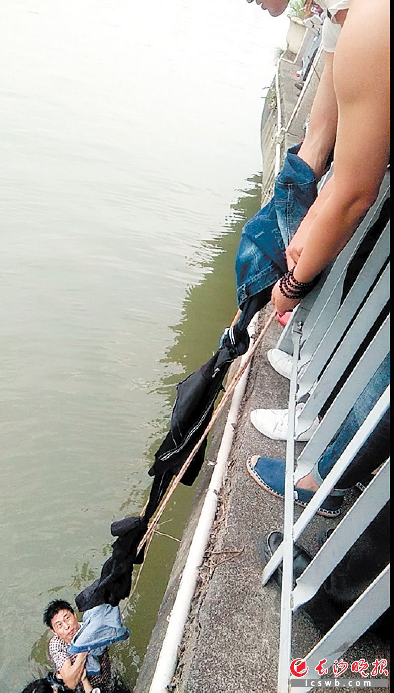 江水湍急,還有暗流,竹竿裂開,難以持久,父女倆隨時可能被江水卷走。一位大媽急中生智,要大家脫下衣服結(jié)成繩子救人。很快,大家就湊齊了五六件衣服,迅速結(jié)成一根簡易的救援繩放下去。父女倆抓住衣服后,總算停止了下沉。