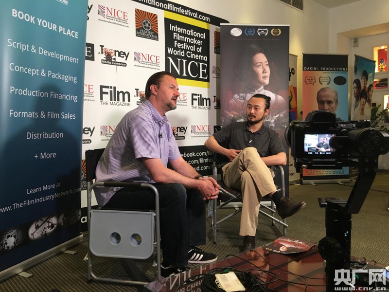 “最佳新人導(dǎo)演”鄧楚煒(右)接受當(dāng)?shù)孛襟w采訪