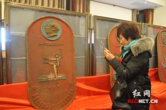 為紀(jì)念毛澤東誕辰123周年,12月18日上午,“紅色經(jīng)典巨型徽章特展”在湘潭白石古玩街開幕,共展出90余枚上個世紀(jì)50年代至70年代的紅色徽章。