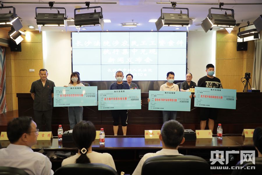 央廣網(wǎng)長沙7月11日消息(記者姜文婧 通訊員李昭菲)7月10日長沙市中級(jí)人民法院召開長沙法院涉農(nóng)民工工資案件執(zhí)行集中兌現(xiàn)新聞發(fā)布會(huì)。10位省、市人大代表、政協(xié)委員應(yīng)邀到現(xiàn)場監(jiān)督執(zhí)行。