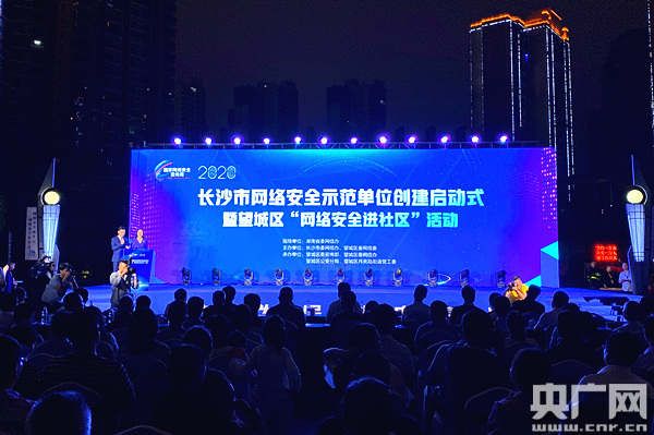 9月16日晚,長(zhǎng)沙市網(wǎng)絡(luò)安全示范單位創(chuàng)建啟動(dòng)式暨“網(wǎng)絡(luò)安全進(jìn)社區(qū)”活動(dòng)在長(zhǎng)沙市望城區(qū)月亮島街道天鵝塘社區(qū)舉行(央廣網(wǎng)記者 堯遙 攝)