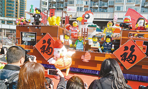 旅發(fā)局花車主題為“開(kāi)年、開(kāi)運(yùn)、開(kāi)心”,花車全由LEGO砌成,不但有“雞”、“!、“財(cái)神”等傳統(tǒng)裝飾,還有20個(gè)代表各行各業(yè)的樂(lè)高人向市民拜年,其中“樂(lè)高雞”由22萬(wàn)塊積木砌成、“財(cái)神”由8萬(wàn)塊積木砌成,十分矚目。