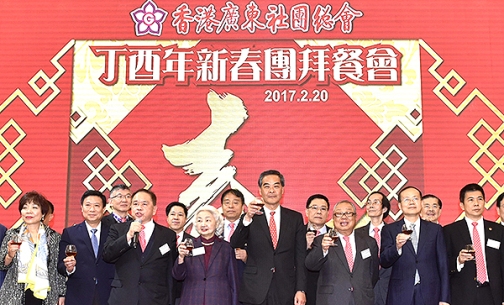 香港廣東社團(tuán)總會(huì)日前舉行丁酉年新春團(tuán)拜餐會(huì)。香港特別行政區(qū)行政長(zhǎng)官梁振英、中央政府駐港聯(lián)絡(luò)辦副主任楊健等應(yīng)邀擔(dān)任主禮嘉賓,共賀新春。
