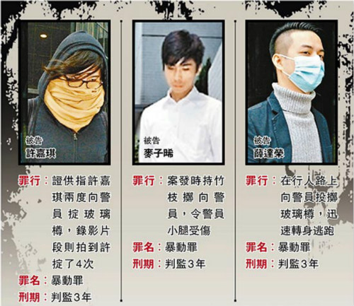 3名被告許嘉琪、麥子晞及薛達(dá)榮因參與旺角暴亂,16日被裁定暴動罪成立。法官判刑時(shí)表示,從呈上法庭的錄影片段可見參與暴動的人不斷全力向警方防線投擲玻璃瓶及竹竿,明顯有意令警員嚴(yán)重受傷,情況非常嚴(yán)重,一旦暴力蔓延,情況隨時(shí)失控。