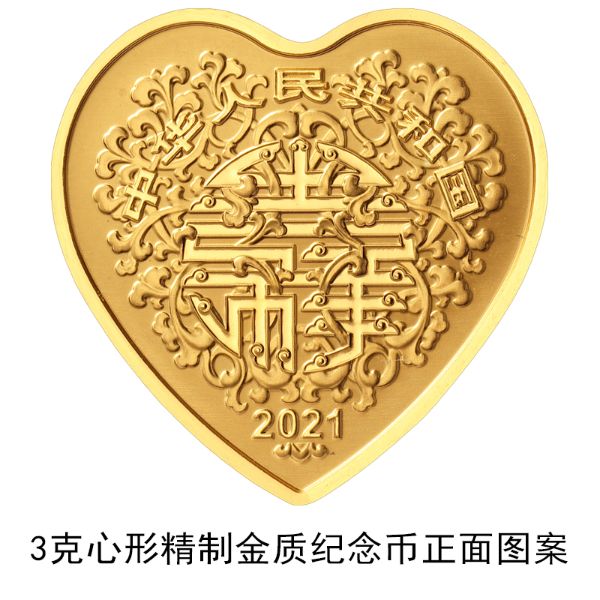 3克心形金質(zhì)紀(jì)念幣為精制幣,含純金3克,外接正方形邊長(zhǎng)18毫米,面額50元,成色99.9%,最大發(fā)行量20000枚。