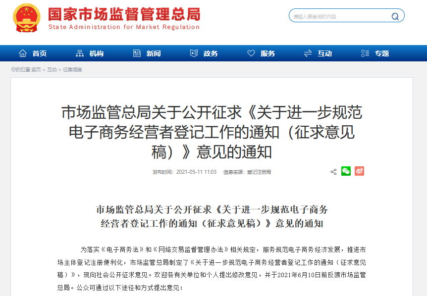 央廣網(wǎng)北京5月11日消息(記者 牛谷月)記者從市場監(jiān)管總局官網(wǎng)獲悉,為服務(wù)規(guī)范電子商務(wù)經(jīng)濟發(fā)展,推進市場主體登記注冊便利化,市場監(jiān)管總局制定了《關(guān)于進一步規(guī)范電子商務(wù)經(jīng)營者登記工作的通知(征求意見稿)》(以下簡稱“意見稿”),即日起向社會公開征求意見。