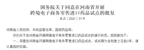央廣網(wǎng)北京5月14日消息(記者 黃昂瑾)記者從中國政府網(wǎng)獲悉,國務(wù)院12日批復(fù)同意在河南省開展跨境電子商務(wù)零售進(jìn)口藥品試點,試點期為自批復(fù)之日起3年。