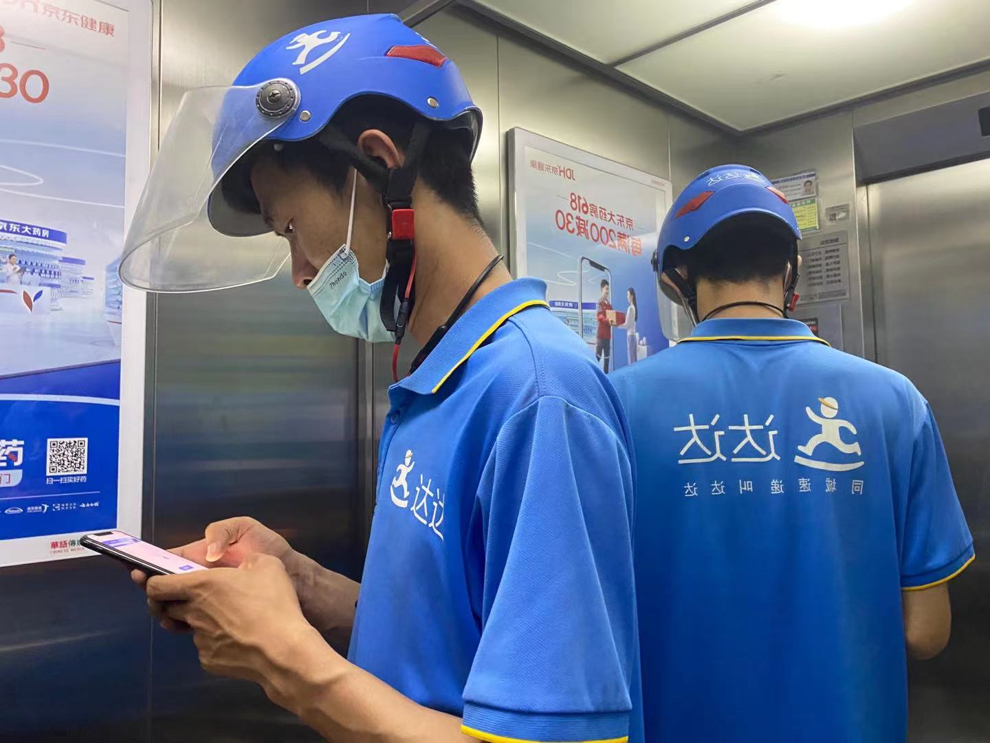 電梯里孫德權(quán)在刷手機(jī),看附近有沒有其他訂單