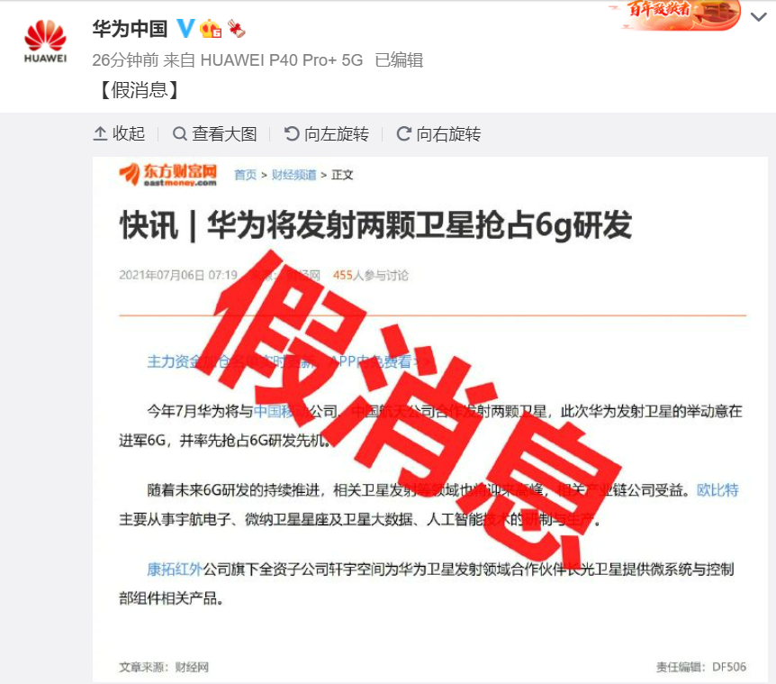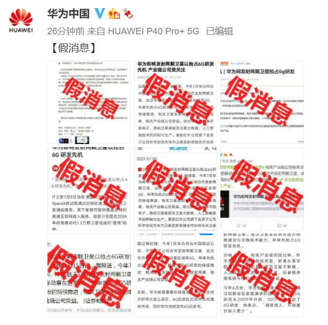 央廣網(wǎng)北京7月6日消息(記者 楊柳青)此前據(jù)媒體報(bào)道,今年7月華為將與中國(guó)移動(dòng)公司、中國(guó)航天公司合作發(fā)射兩顆衛(wèi)星,此次華為發(fā)射衛(wèi)星的舉動(dòng)意在進(jìn)軍6G,并搶占6G研發(fā)先機(jī)。6日上午,華為中國(guó)官方微博辟謠,“華為即將發(fā)射兩顆衛(wèi)星以搶占6G研發(fā)先機(jī)”為假消息。
