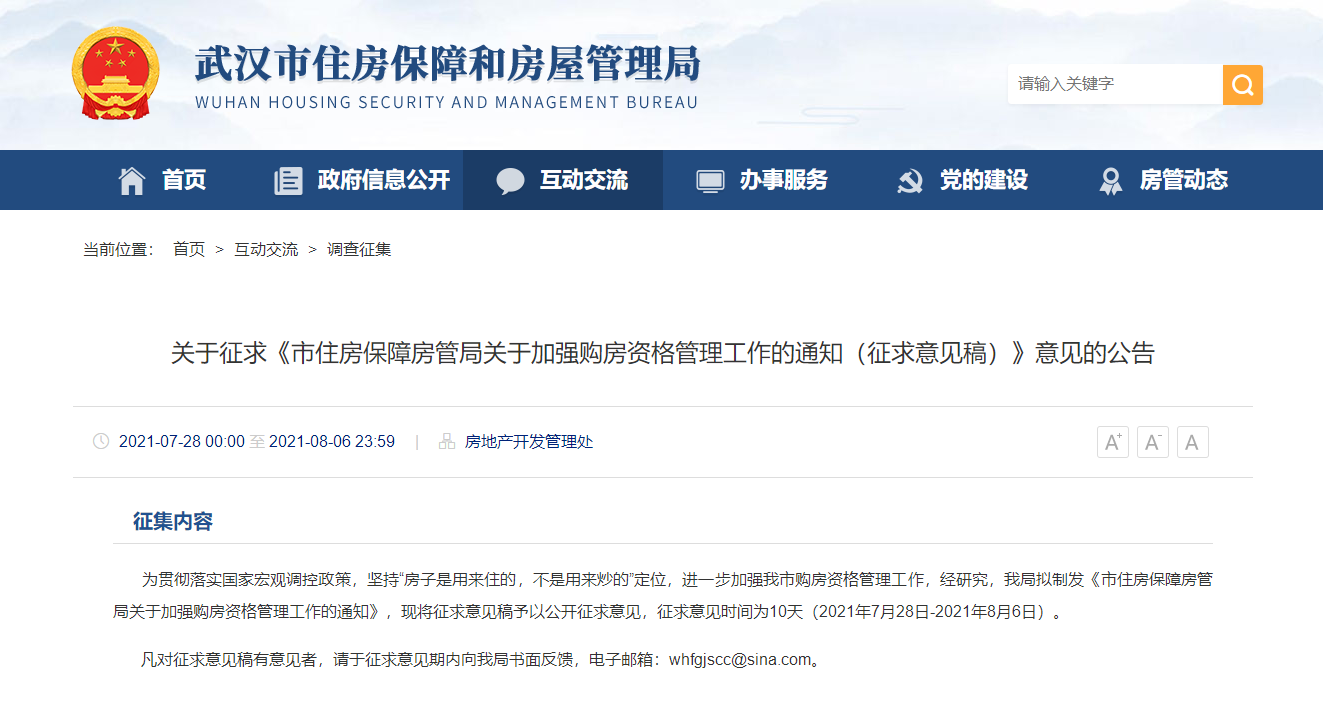 28日,武漢市住房保障和房屋管理局發(fā)布《武漢市住房保障房管局關(guān)于加強購房資格管理工作的通知(征求意見稿)》(以下簡稱“意見稿”),征求意見時間為10天(2021年7月28日-2021年8月6日)。