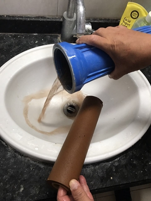 業(yè)主于先生家里安裝了一套雙級(jí)精密過(guò)濾器,水管盡頭還接有一套家用軟水機(jī),為了讓記者清楚了解水質(zhì)的情況,他取出了一個(gè)過(guò)濾器中的PE棉過(guò)濾芯。大家都知道過(guò)濾芯是白色的,一般情況下,可以用6個(gè)月,剛用一個(gè)月的時(shí)候,顏色是不會(huì)發(fā)生太大變化的,而記者在王先生家里看到的過(guò)濾芯,使用一個(gè)月后已經(jīng)變成了深泥黃色,之后倒出的水類似渾濁的泥水,手伸進(jìn)過(guò)濾器后,可以從底部掏出大量泥沙等雜質(zhì)。