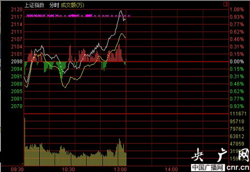 午盤(pán):滬指漲0.87%重返2100點(diǎn) 白酒股領(lǐng)漲