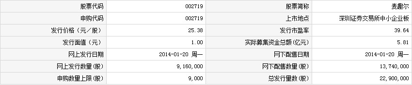 麥趣爾此次發(fā)行總數(shù)為2,290萬股,網(wǎng)上發(fā)行916萬股,發(fā)行市盈率39.64倍,申購代碼:002719,申購價格:25.38元,單一帳戶申購上限9,000股。