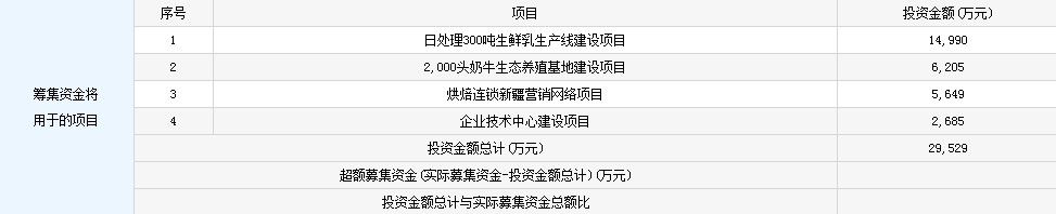 公司現(xiàn)有門店38家,計劃建設(shè)42家門店和6家中央工廠。本次募投項目為日處理300噸生鮮乳生產(chǎn)線(目前產(chǎn)能日處理100噸)、2000頭奶牛生態(tài)養(yǎng)殖基地建設(shè)、烘焙連鎖新疆營銷網(wǎng)絡(luò)和企業(yè)技術(shù)中心建設(shè)。