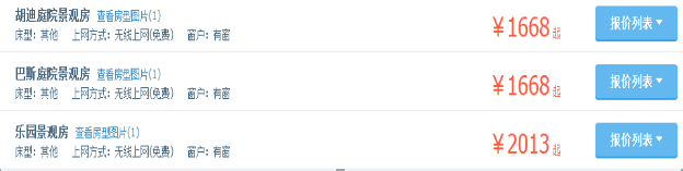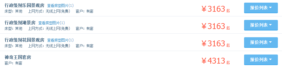 數(shù)據(jù)顯示,在阿里旅行的上海迪士尼度假區(qū)官方旗艦店,目前一日門票銷量已經(jīng)接近4萬(wàn)張,兩日聯(lián)票銷量也超過(guò)1萬(wàn)張。兩家主題酒店,也就是上海迪士尼度假區(qū)玩具總動(dòng)員酒店和價(jià)格更高的上海迪士尼樂(lè)園酒店,目前只能預(yù)訂7月1日以后的客房。(下圖分別是兩家主題酒店部分不同房型的每晚價(jià)格)