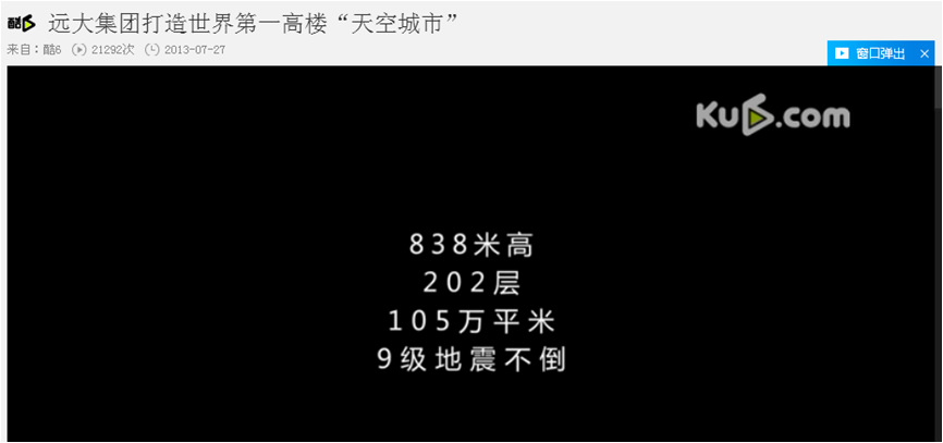 這部宣傳片列舉了一長(zhǎng)串驚人數(shù)字:“天空城市”將建造838米,地上202層,地下6層,共計(jì)208層,超越迪拜哈里發(fā)塔(828米)成為世界第一高樓。項(xiàng)目?jī)粽嫉?0畝,建筑面積105萬(wàn)平方米,9級(jí)地震不倒。