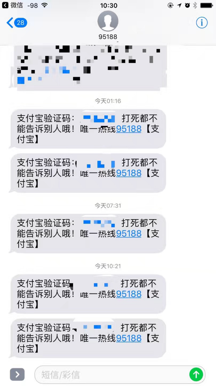 Jack:“突然一長(zhǎng)串號(hào)碼,發(fā)來(lái)一條短信,自稱是支付寶,里面有一個(gè)幾位數(shù)字的驗(yàn)證碼。我也不知道這條短信要干嘛,上面就說(shuō)給你這個(gè)驗(yàn)證碼,不要把這個(gè)驗(yàn)證碼給別人!