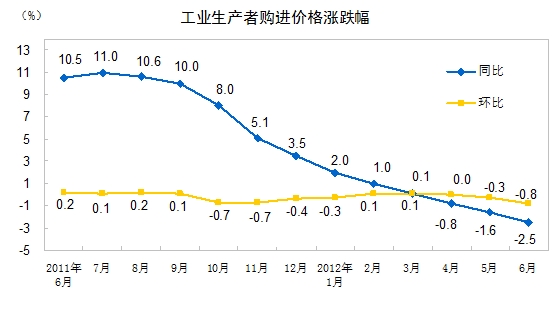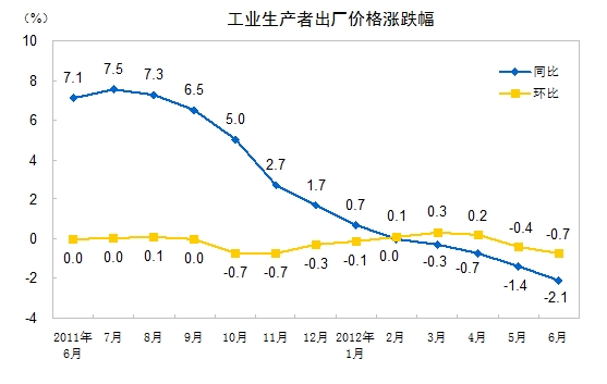 中廣網(wǎng)北京7月9日消息 國(guó)家統(tǒng)計(jì)局今日公布的數(shù)據(jù)顯示,2012年6月份,全國(guó)工業(yè)生產(chǎn)者出廠價(jià)格同比下降2.1%,環(huán)比下降0.7%。工業(yè)生產(chǎn)者購(gòu)進(jìn)價(jià)格同比下降2.5%,環(huán)比下降0.8%。上半年,工業(yè)生產(chǎn)者出廠價(jià)格同比下降0.6%,工業(yè)生產(chǎn)者購(gòu)進(jìn)價(jià)格同比下降0.3%。