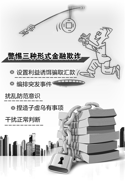 據(jù)介紹,目前金融詐騙活動有三種常見方式:一是設(shè)置利益誘餌騙取匯款:典型的有詐騙分子采用電話或短信群發(fā)的方式,發(fā)布“活動中獎”、“低息無抵押小額貸款”、“稅費退返”等消息,巧立名目要求受害者向詐騙分子指定的賬戶匯出“手續(xù)費”、“公證費”、“郵寄費”、“稅費返點”等款項;二是編排突發(fā)事件擾亂防范意識:典型的有冒充銀行業(yè)金融機構(gòu)官方信息平臺,發(fā)布“銀行卡異地巨額消費”短信,冒充親朋好友在異地急需資金救急等,誘騙群眾匯出資金;三是捏造子虛烏有事項干擾正常判斷:典型的有謊稱“賬戶涉嫌洗錢犯罪”、“個人信息遭泄、銀行賬戶不安全”、“郵寄的物品中藏有毒品”等,要求消費者直接將賬戶資金轉(zhuǎn)入所謂的“公共安全部門設(shè)立的安全賬戶”以“保障資金安全”,或冒充公、檢、法工作人員套取消費者的賬戶名稱和交易密碼。