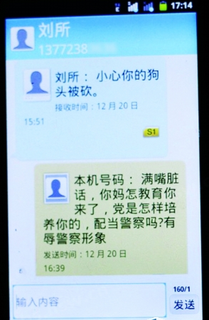 帖子中還附有一張手機(jī)短信對(duì)話的照片,照片顯示,該手機(jī)在12月20日15點(diǎn)51分收到一條來(lái)自通訊錄名字為“劉所”的短信:“小心你的狗頭被砍。”50分鐘后,該手機(jī)回復(fù):“滿嘴臟話,你媽怎教育你來(lái)了,黨是怎樣培養(yǎng)你的,配當(dāng)警察嗎?有辱警察形象。”