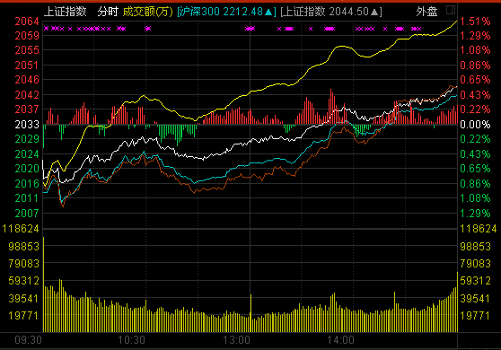 截至收盤,滬指報(bào)2044.50點(diǎn),上漲11.42點(diǎn)點(diǎn),漲幅0.56%,成交678.30億元;深成指報(bào)7616.57點(diǎn),上漲43.94點(diǎn),漲幅0.58%,成交1139.54億元;創(chuàng)業(yè)板指報(bào)1532.69點(diǎn),上漲36.71點(diǎn),漲幅2.45%,成交341.63億元。