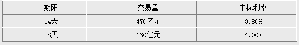中國經(jīng)濟(jì)網(wǎng)北京4月8日訊 據(jù)央行網(wǎng)站消息,央行于今日開展14天470億元及28天160億元逆回購操作,中標(biāo)利率分別為3.8%、4.0%。數(shù)據(jù)顯示,本周公開市場有2320億元正回購到期。