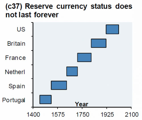 下圖顯示了儲備貨幣在歷史上的變遷,按時間順序成為世界范圍儲備的貨幣依次來自葡萄牙、西班牙、荷蘭、法國、英國和美國: