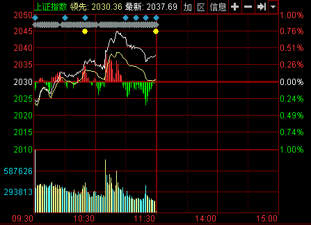 新華網(wǎng)消息 今日早盤滬深兩市雙雙低開,后震蕩反彈,早盤兩市成交量偏小,上證指數(shù)及深圳成指表現(xiàn)強于創(chuàng)業(yè)板指數(shù),兩市上漲個股多于下跌個股。盤中網(wǎng)絡(luò)彩票概念股走強,金融股發(fā)力走強,銀行股全線飄紅,助大盤繼續(xù)沖高,此外,地產(chǎn)股也有較好表現(xiàn)。截至午盤,滬指報2037.69點,上漲7.73點,漲幅0.38%,成交304.69億元;深成指報7241.12點,上漲5.73點,漲幅0.08%,成交436.35億元;創(chuàng)業(yè)板指報1336.27點,下跌14.18點,跌幅1.05%,成交131.76億元。