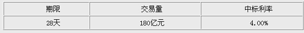 中國(guó)經(jīng)濟(jì)網(wǎng)北京6月24日訊 據(jù)央行網(wǎng)站消息,央行今日開展180億元28天期限正回購(gòu)操作,中標(biāo)率為4%。具體情況如下: