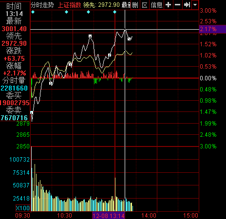 央廣網(wǎng)財(cái)經(jīng)12月8日消息 今日午后大盤(pán)延續(xù)上漲趨勢(shì),開(kāi)盤(pán)僅14分鐘,滬指便沖破3000點(diǎn)大關(guān),略微下跌后再次站上3000點(diǎn),創(chuàng)44個(gè)月新高。