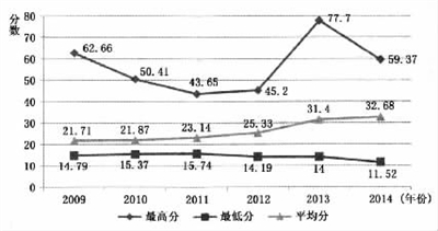 歷年省級(jí)財(cái)政透明度得分的最高分、最低分和平均分