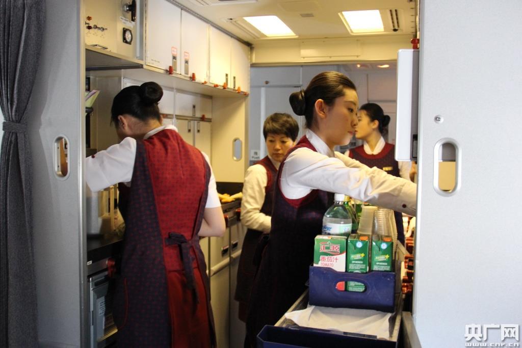 乘務員在給旅客們準備飲料。在北京飛往成都的2小時40分鐘的航程里,乘務員要給旅客提供兩次飲料和一次餐食,還有一次收餐服務。